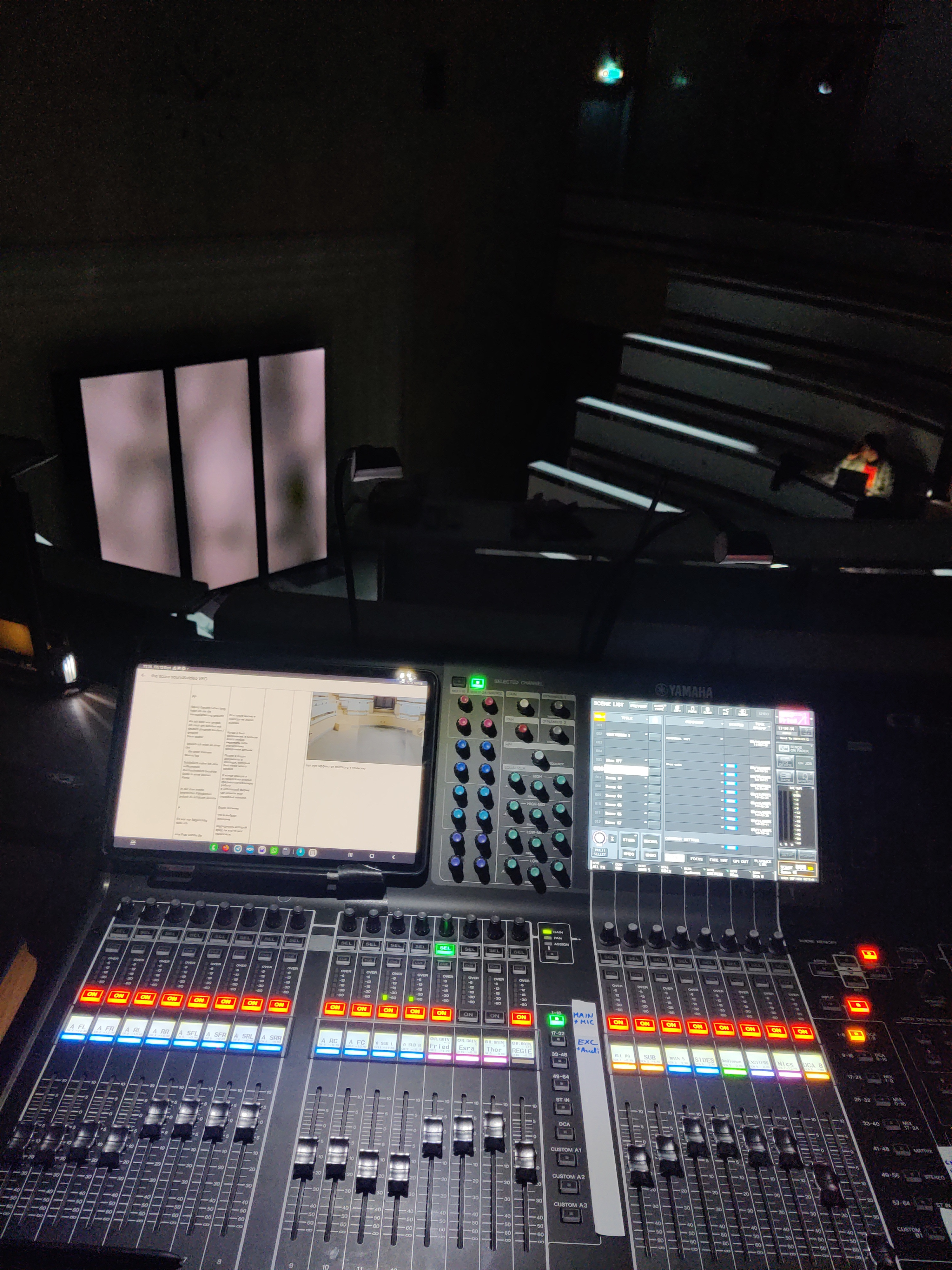 Heute HP1 (Hauptprobe) für Vegetarian, ich fuhr die Show das erste Mal komplett. Natürlich noch kleine technische Probleme direkt vor Beginn (hatte auf einmal jedes Mikrophon auf jedem Eingangskanal, war wohl irgendein Loopback über ein wildlaufendes Dante Gerät), danach lief's aber ziemlich gut.