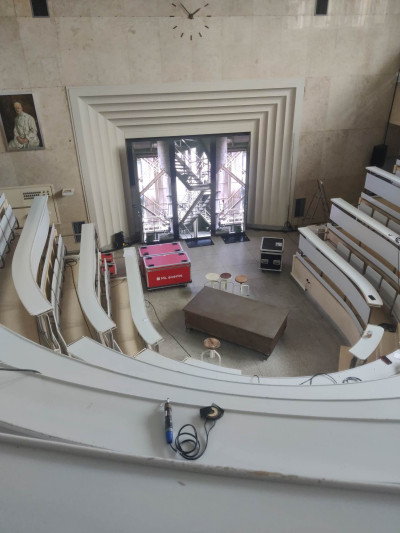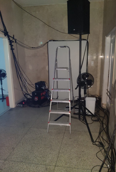 Auch heute wieder den ganzen Tag in der Chirurgie - Probe bis Mittags, danach Aufräumen / schön machen (ehm, sort of, siehe Technik-Ecke-Bild), mit Leuten unterhalten und dann Liza betreuen, die hier ihren Spatial Mix macht.